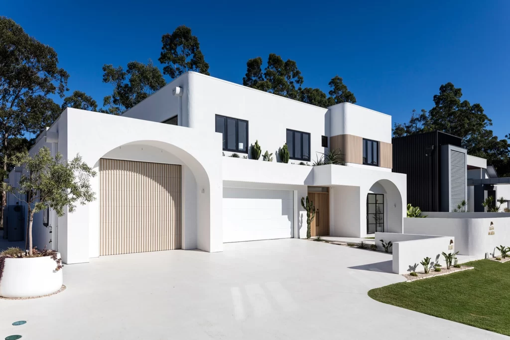 Birchwood Residence is set amongst one of Australia’s iconic golf courses, which inspired a layout that connects with its natural surroundings, reaching out to the bushland and trees and encouraging a house filled with natural light and a bright palette. Hammered rendered walls, arch profiles and integrated planters over the entry give the house its Mediterranean islands vibe and striking streetscape.