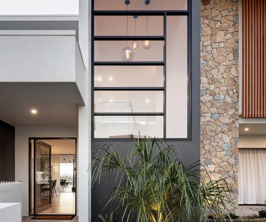 Built on the face of a well known ridge south of the Brisbane city, Dagmar Street residence takes its position overlooking the Brisbane City and mountain range beyond. Its elevation gives the site unrivalled views of the city lights. The house was designed in sync with the site’s natural topography, taking advantage of the fall and utilising the undercroft as basement garage, leaving the upper two levels to take full advantage of the floor plate and views that they offer. Timber and Stone combine to create depth, interest and add warmth to the houses exterior.