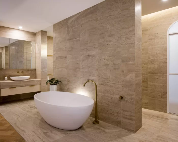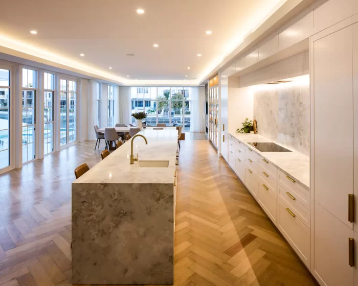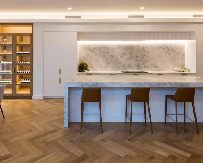 The interior was designed to complement the exterior form and style, create a high end product that addresses the prestige and sophistication of its location. Throughout, high end finishes such as natural stone and travertine balance to create an inviting and warm house, exuding the high end feel the house calls for.