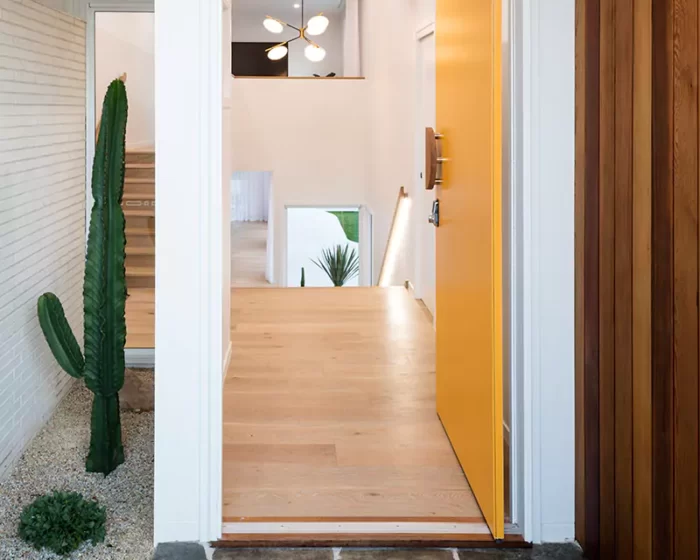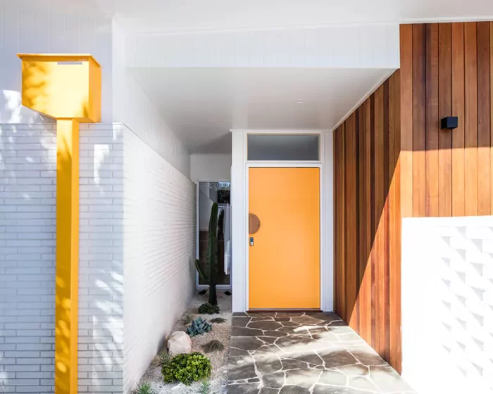 Paxton Street residence takes its form from the houses of 1950’s Palm Springs, most notably in its butterfly roof form and bright yellow door. This inspiration set the tone for the house, both in its aesthetic and function – the house is based on the principles of modernism and mid-century design connecting the interior and exterior, with an external palette that produces interest through its form, texture and colour.